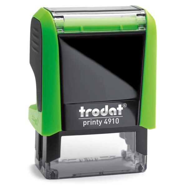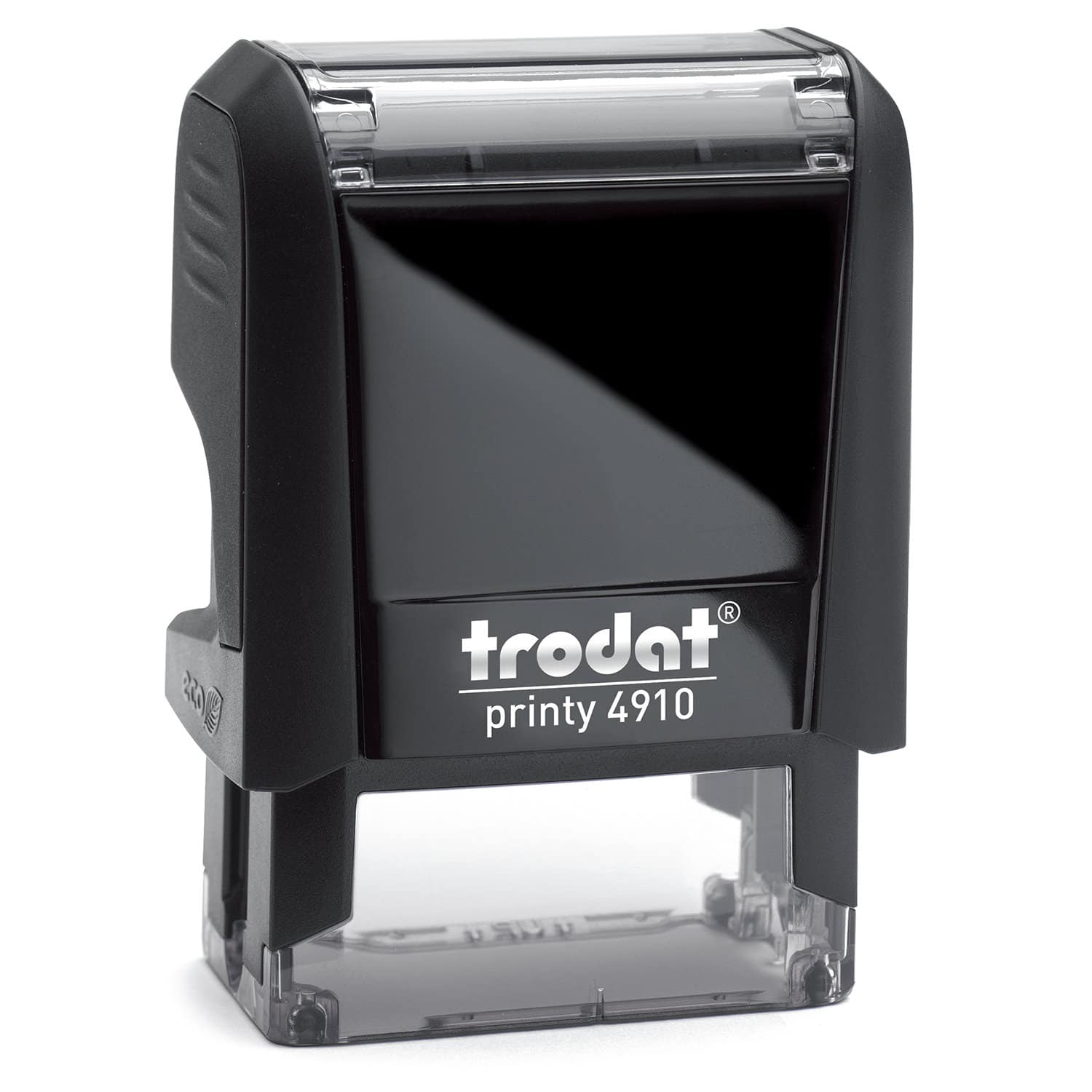 The Trodat Printy 4910 is a plastic self-inking stamp with a rectangular text plate. This is a very common format, particularly suitable for names and functions of people.