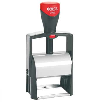 Le Colop Classic Line 2400 est un tampon encreur en métal avec une plaque de texte rectangulaire.
